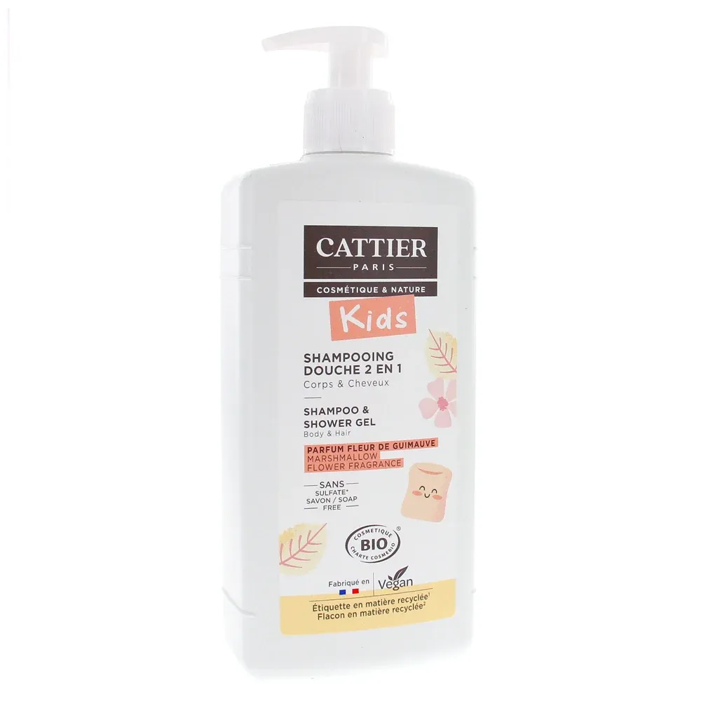 Découvrez le shampoing douche 2en1 Cattier Kids à la fleur de guimauve bio, un soin certifié bio et végan qui nettoie en douceur la peau et les cheveux fragiles des enfants dès 3 ans, sans piquer les yeux.