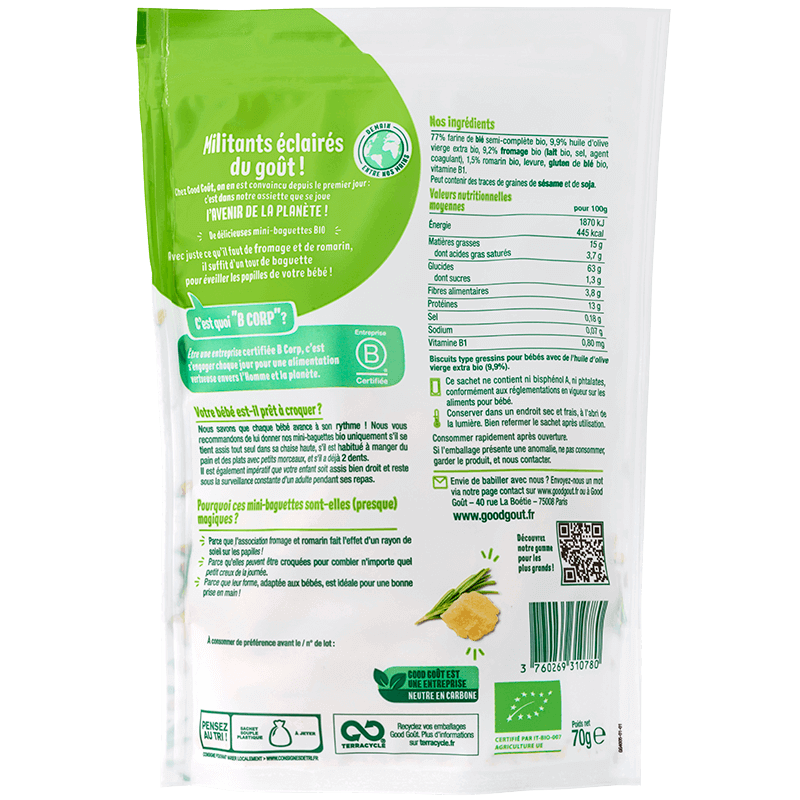 La recette de ces mini baguettes Good Goût privilégie des ingrédients simples et de qualité issue de l’agriculture biologique. Voici sa composition exacte :