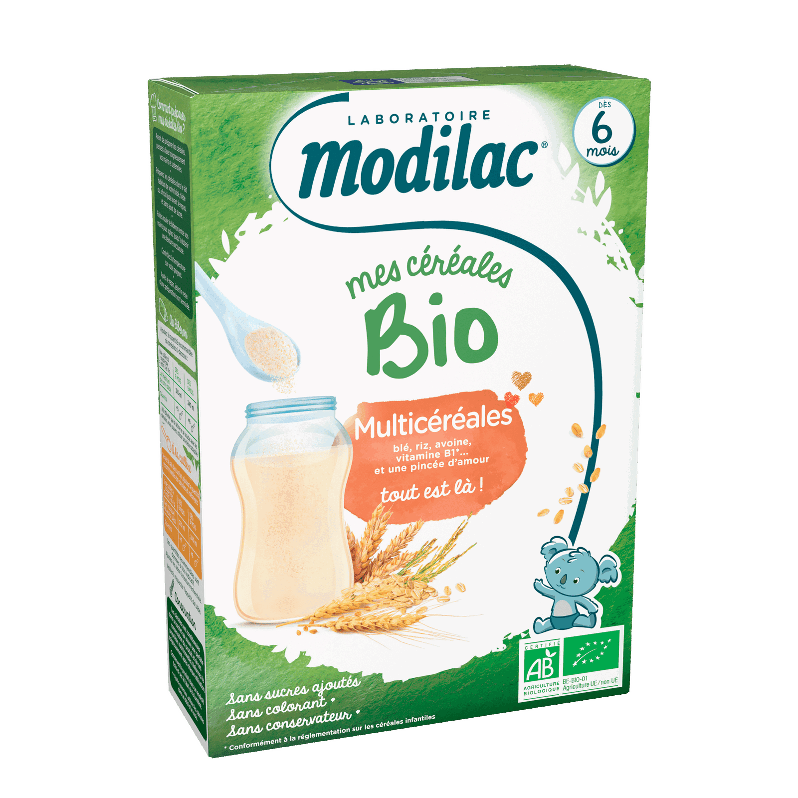 Mes céréales bio de Modilac est une préparation prête à l’emploi qui est à reconstituer avec le lait infantile et elle ne contient pas de sucres ajoutés car elle contient uniquement les sucres naturellement présents. Les céréales Bio sont le blé, le riz et l’avoine.