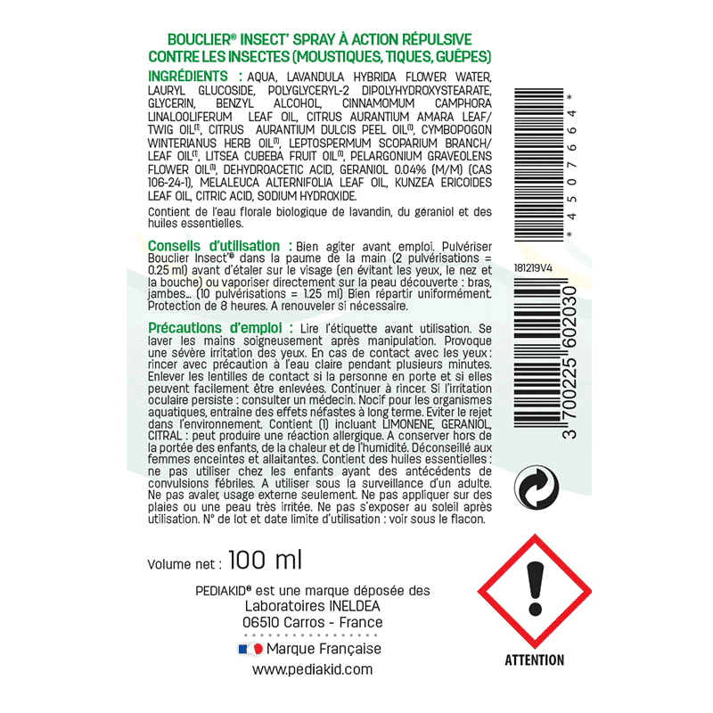Conseils d’utilisation : Bien agiter avant emploi. Pulvériser Bouclier Insect’® dans la paume de la main (2 pulvérisations = 0.25 ml) avant d’étaler sur le visage (en évitant les yeux, le nez et la bouche) ou vaporiser directement sur la peau découverte: bras, jambes… (10 pulvérisations = 1.25 ml) Bien répartir uniformément. Protection de 8 heures. A renouveler si nécessaire.