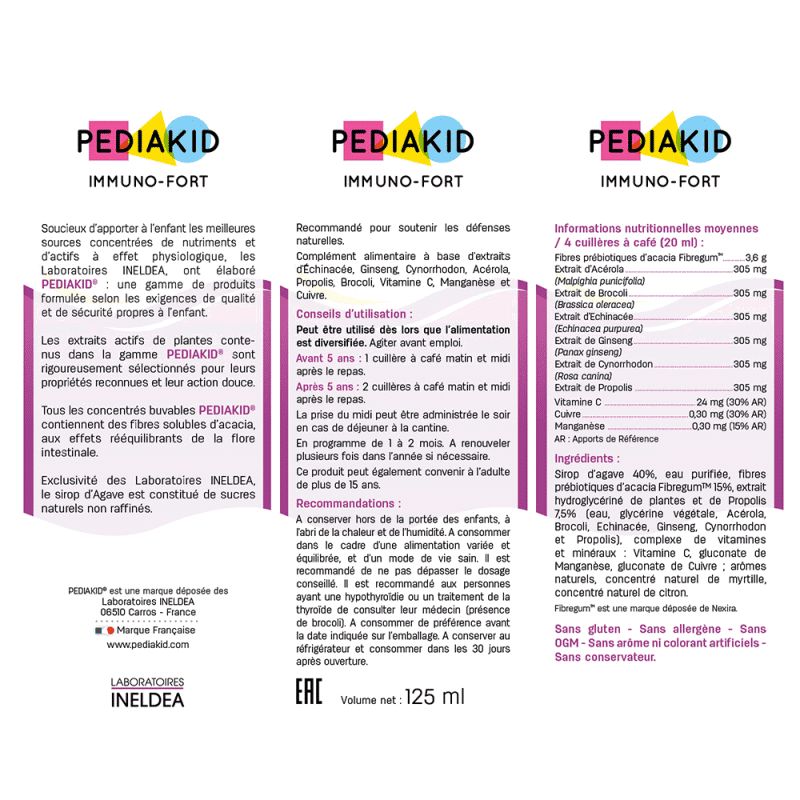 Chaque formule sirop PEDIAKID est constituée d’une base de Nectar d’Agave et de fibres prébiotiques d’Acacia, à laquelle viennent d’ajouter des extraits hydroglycérinés de plantes, des vitamines et des minéraux spécifiques à chaque formule.