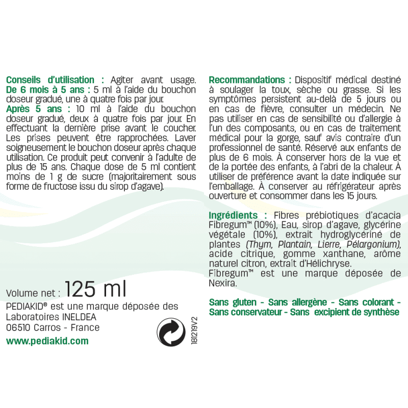 <a href="https://www. Les fibres d’acacia forment un film sur la muqueuse pour en soulager l’irritation et pour la protéger des agents extérieurs irritants. La glycérine végétale, grâce à ses propriétés lubrifiantes, humectantes et émollientes, favorise l’hydratation du mucus facilitant ainsi son expectoration physiologique, tout en apaisant la muqueuse irritée. Le sirop PEDIAKID® Toux Sèche & Grasse contient également des extraits de plantes traditionnellement utilisées dans le traitement de la toux (Thym, Plantain, Lierre, Hélichryse et Pélargonium). Au délicieux arôme naturel de citron.