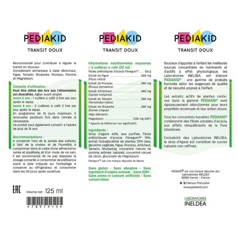 PEDIAKID® Transit Doux a été spécialement formulé à base d’extraits actifs de plantes et de fruits pour réguler naturellement et en douceur le transit. Sa formule à base d’Artichaut, Figue, Rhubarbe et Tamarin, est idéale pour participer au bon fonctionnement digestif, réguler le transit et améliorer le confort intestinal au quotidien.