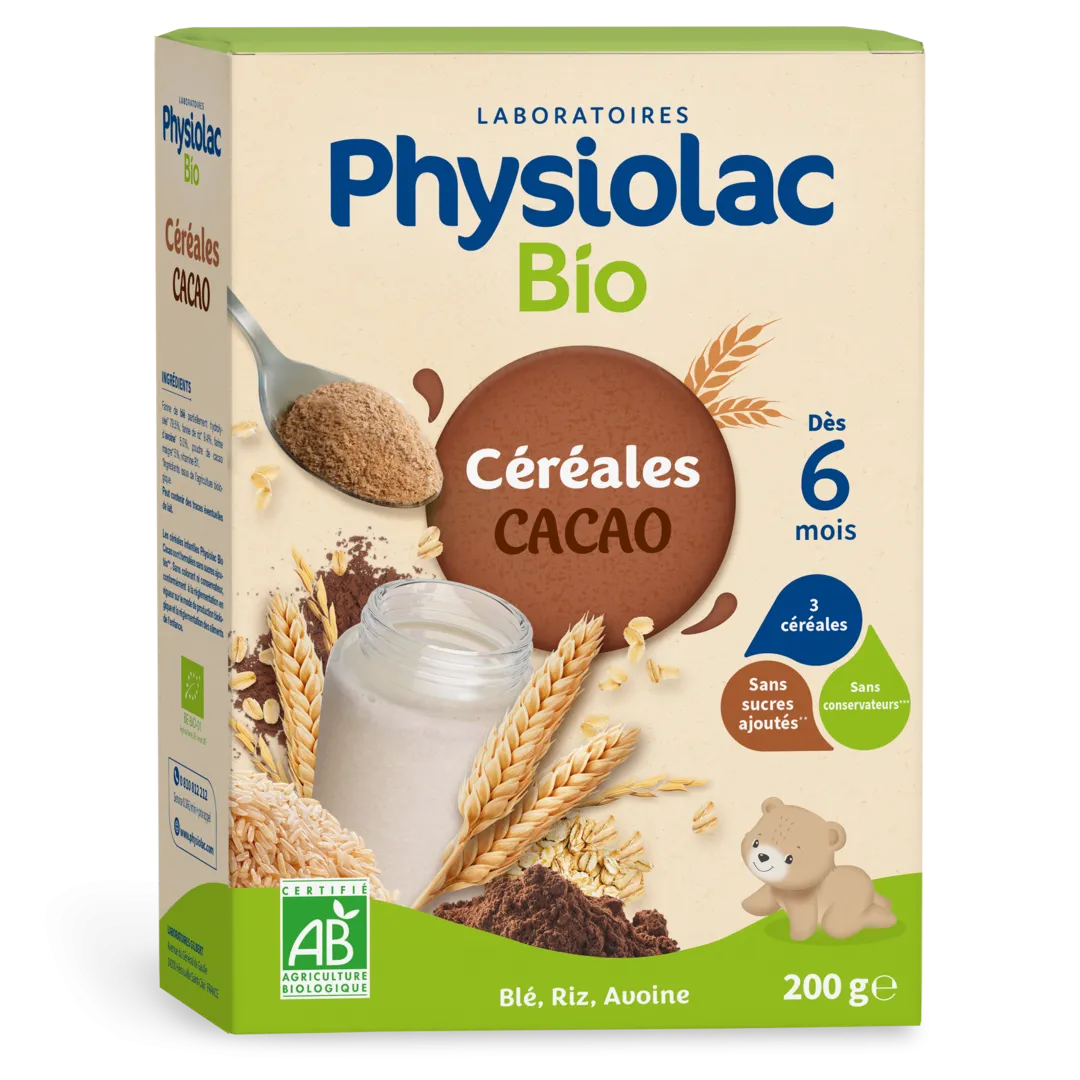 Pour accompagner en douceur la diversification alimentaire de bébé, les céréales bio au cacao Physiolac offrent un petit-déjeuner ou un goûter savoureux, sans sucres ajoutés et certifiées agriculture biologique.