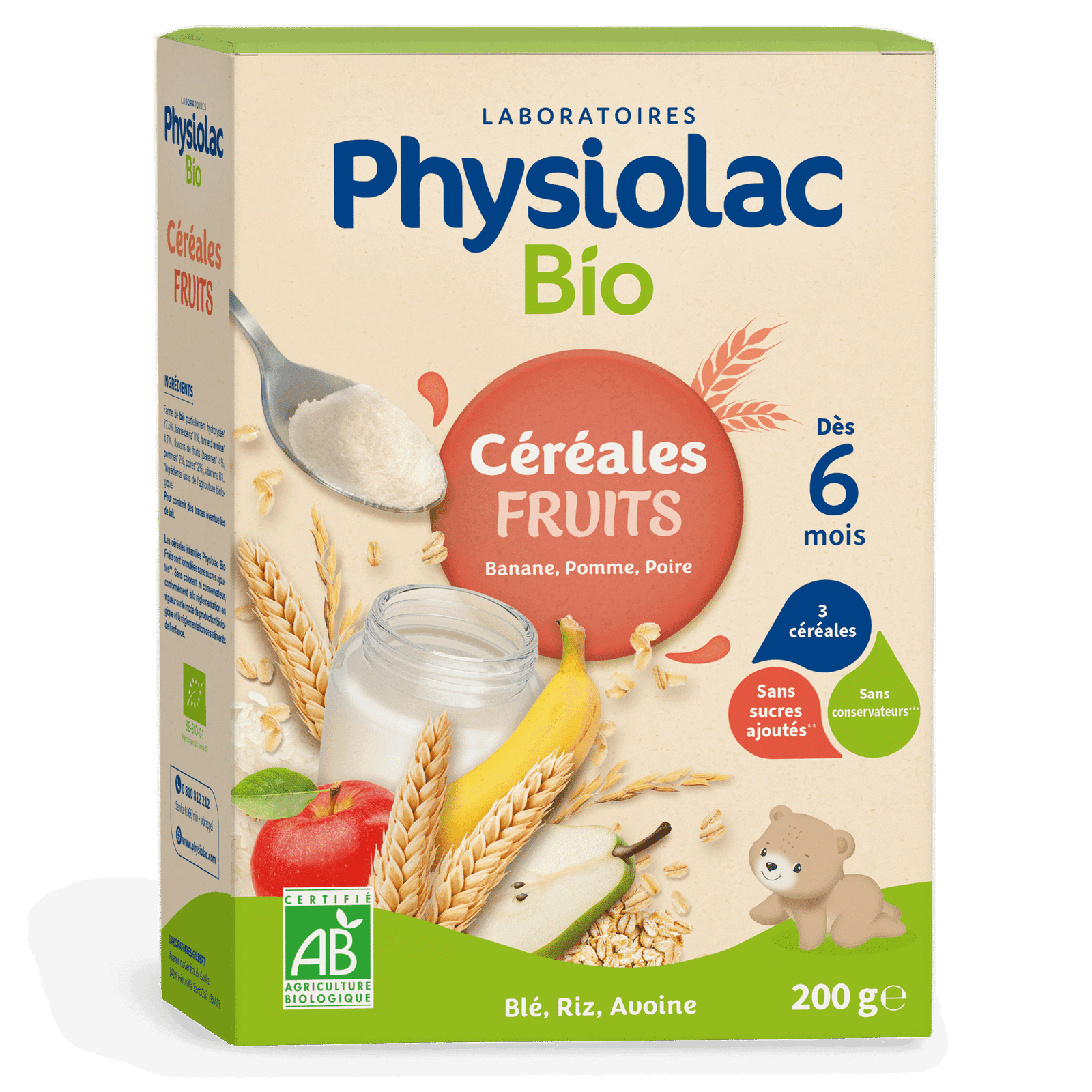 Introduisez en douceur les premières céréales bio de votre bébé dès 6 mois avec Physiolac Bio Fruits, une recette certifiée AB, sans sucres ajoutés, pour une diversification alimentaire respectueuse des papilles sensibles.