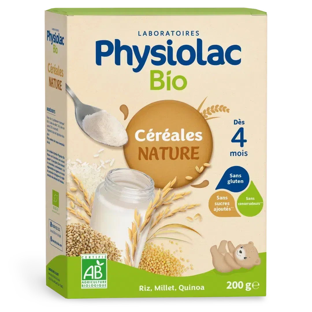 Les céréales infantiles Physiolac Bio Nature dès 4 mois offrent une base saine pour la diversification. Sans gluten ni sucres ajoutés, elles sont composées de riz, millet et quinoa bio pour favoriser la satiété et le transit de bébé.